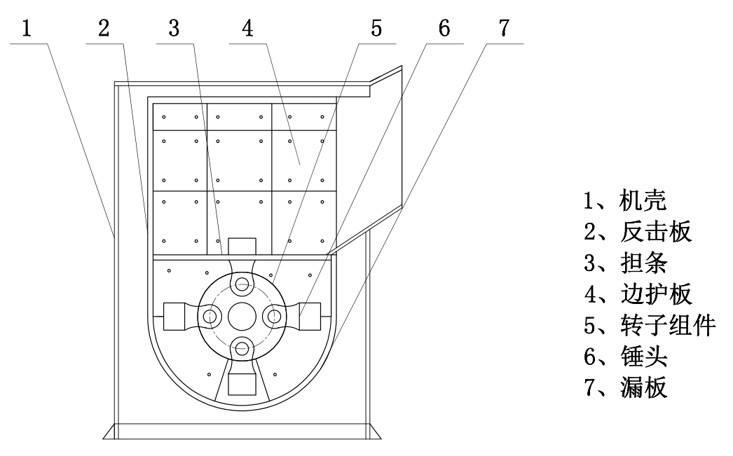 工作原理:電機經皮帶輪傳動帶動轉子旋轉,使裝在轉子盤上的錘頭做高速圓周運動,當物料進入破碎腔后,大塊物料堆放在機內中部的擔條上,被高速旋轉的錘頭擊碎,粒度不合格的大物料和新物料被打向反擊板和漏板進行再次破碎直至合格,合格的物料經漏板排出。